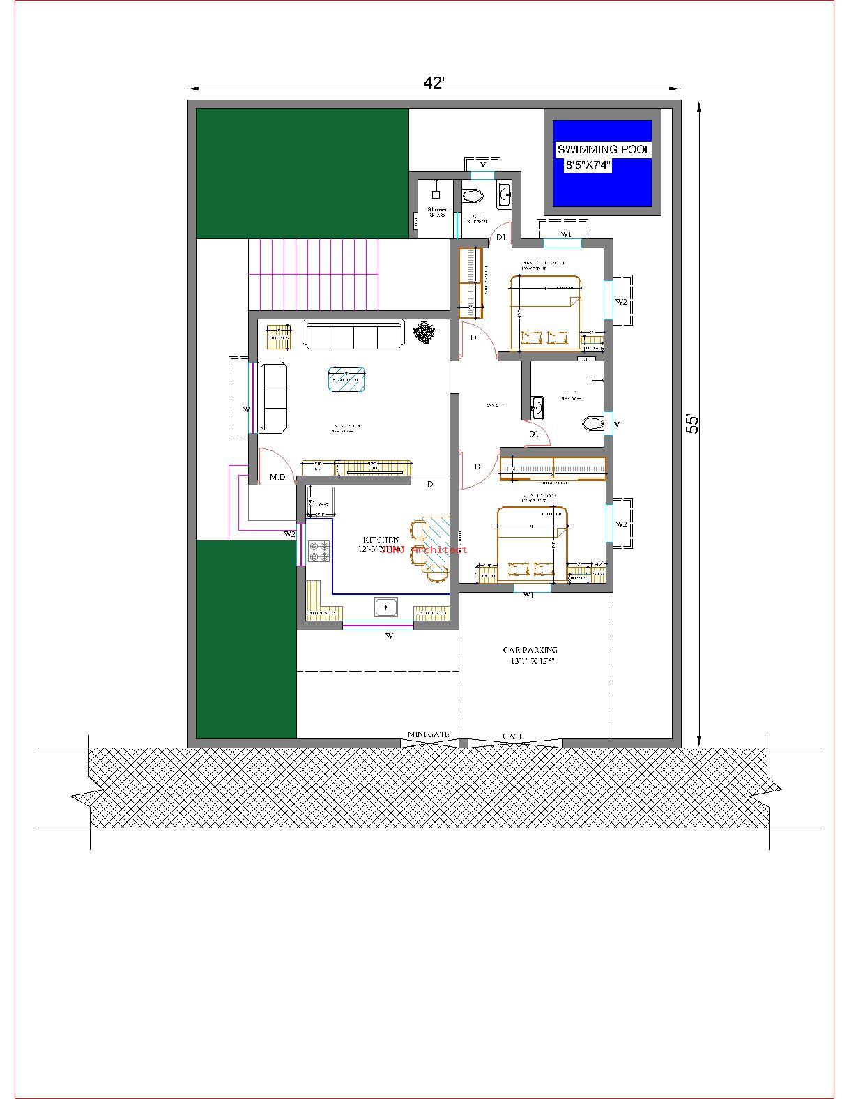 This is a smartly designed modern residential house plan built on a 42’ × 55’ plot, offering an excellent balance of comfort, functionality, and contemporary lifestyle features.
